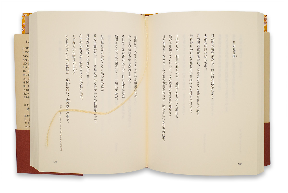 リルケ詩集 Book Design 『リルケ詩集』 著者:リルケ 訳者:片山 敏彦 解説:若松 英輔 装丁・レイアウト・DTP:たけなみゆうこ(コトモモ社) 装画:台町 さや香 リルケの詩集を復刊し、若松英輔さんの解説を加えた一冊です。 表紙は3種類デザインしました。 リルケが生きた時代の本の雰囲気を意識し、柄も当時の印刷物をもとにアレンジして表現しています。 カバーには、手に取ったときに心地よさを感じられる紙を選びました。 文字は大きめで、素直で読みやすいフォントを選びました。 できるだけ多くの方にストレスなく、すっと読んでいただけるよう心がけています。 Creative Fields装丁、レイアウト、DTP Client亜紀書房 Linkamazon